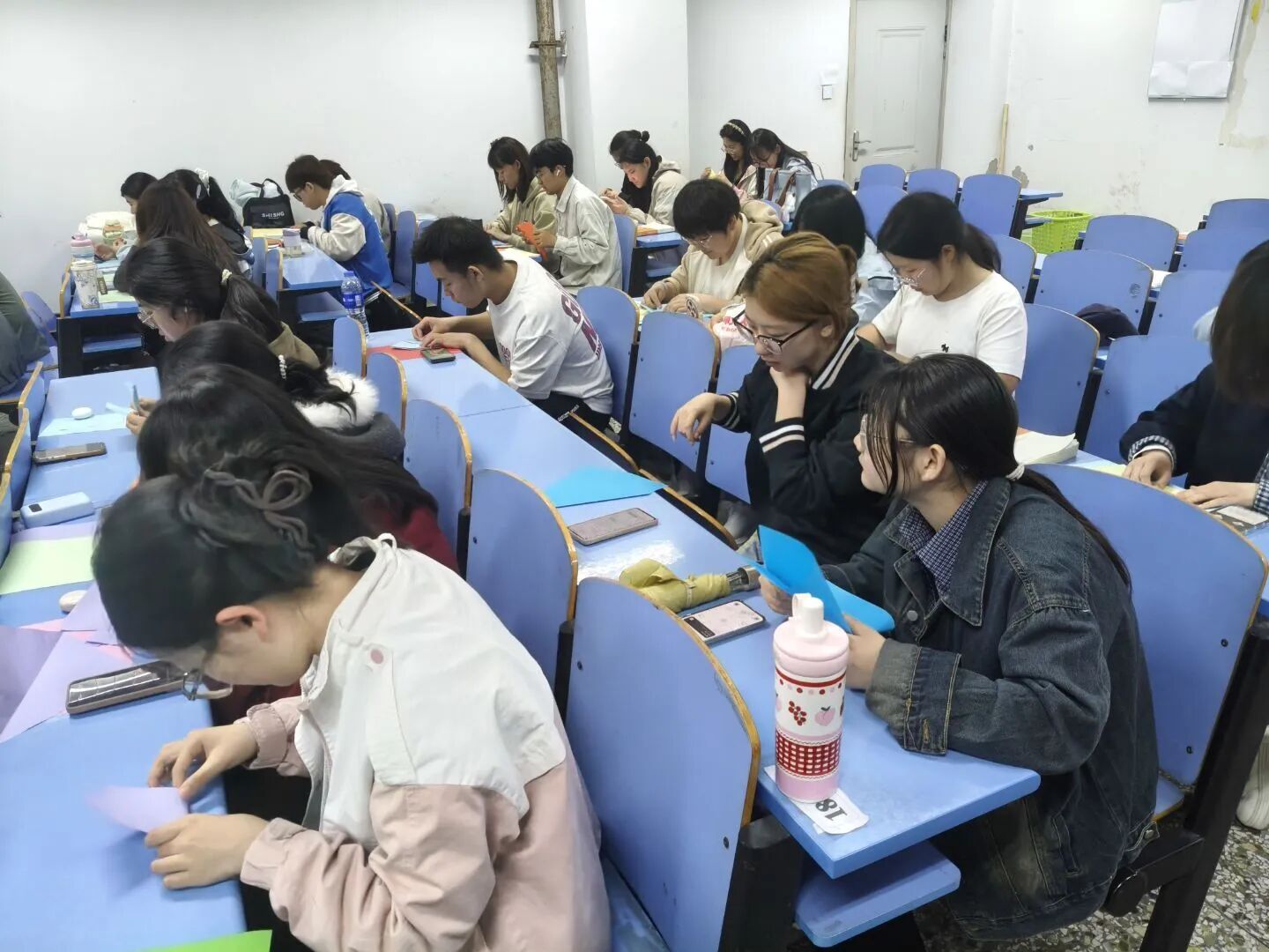 在创作环节,学生以春日为灵感,自由创作或参考纹样进行折纸。大家专注裁剪,彩纸翻飞,创作出多样作品。有的折出花朵,蝴蝶等美好事物,传递对春天的喜爱;有的独具匠心,搭配爱心、船帆等纹样,寄托对亲友、同学的祝福;还有学生结合专业特色,将历史纹样、法律元素与春日意象融合,展现独特创意。现场学生相互交流技巧、分享灵感,在折纸间感受传统技艺的魅力,形成了其乐融融的氛围。