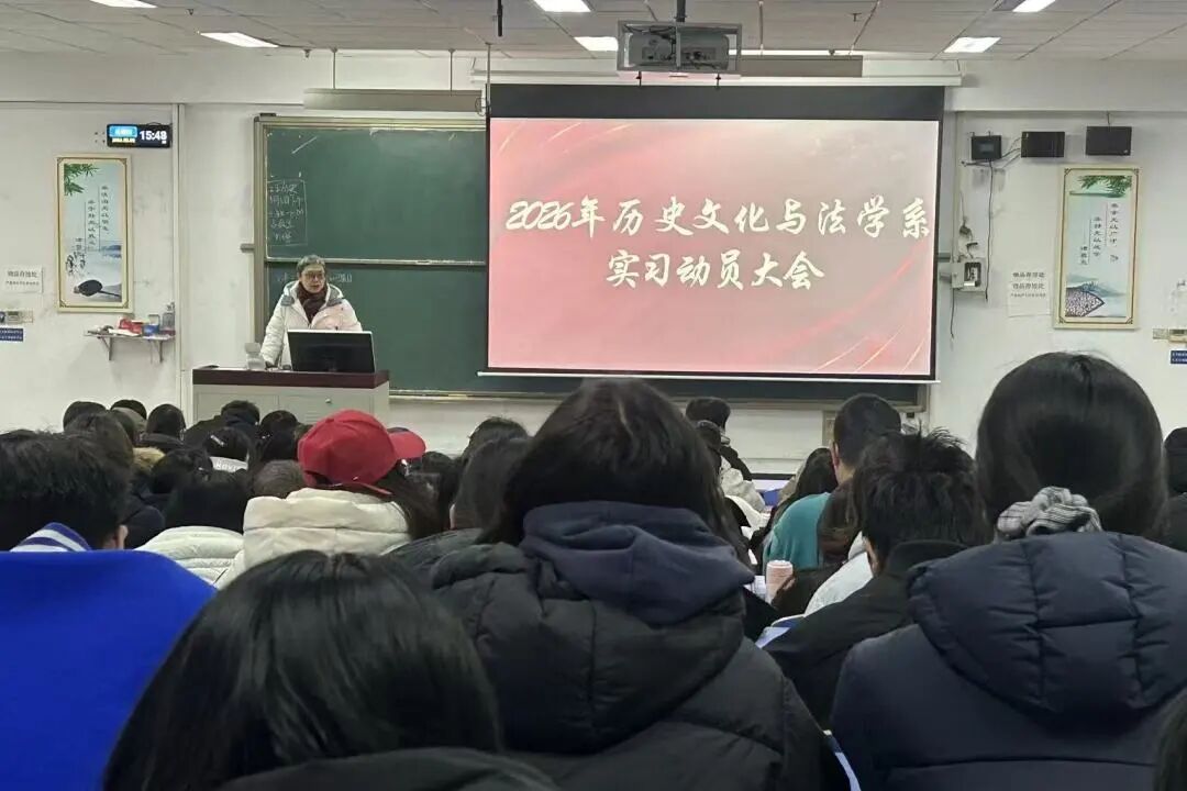 会上,系领导与专业教师分别围绕历史学教育实习、法学专业实践、文化产业管理岗位实践三大模块,对实习时间安排、岗位分配、安全管理、纪律要求、问题反馈机制及考核评价体系等工作进行全面部署,明确各专业实习全流程规范与注意事项。会议强调,全体学生须严格遵守学校及实习单位规章制度,强化安全意识;实习期间如遇问题应第一时间与指导教师沟通反馈,秉持严谨治学态度,虚心求教、深耕实践。
