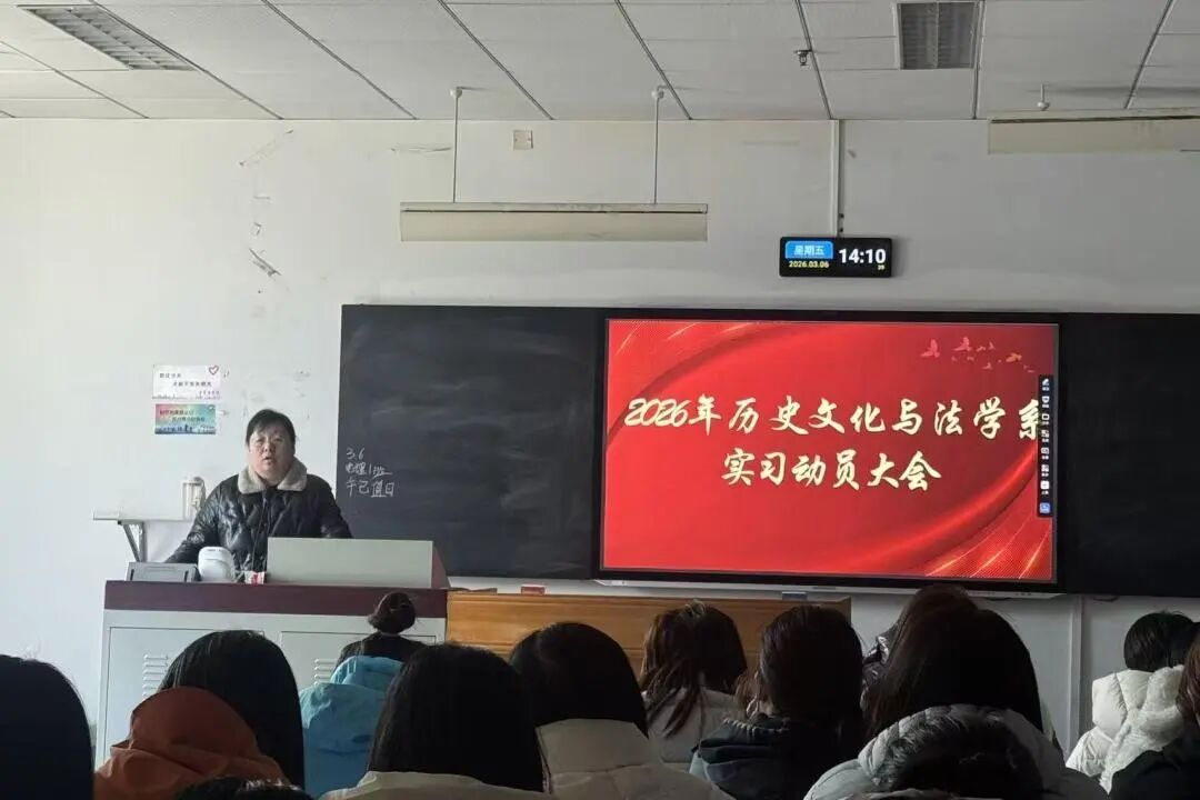 为深入落实立德树人根本任务,扎实提升我系专业人才培养质量,强化教育实习与专业实践的组织管理、安全保障与过程督导,引导学生平稳衔接理论学习与岗位实践,2026年3月5日下午,唐山师范学院历史文化与法学系于北院文四阶梯教室召开2026年实习动员大会。系领导、各专业负责人、实习指导教师和2023级全体学生参会。