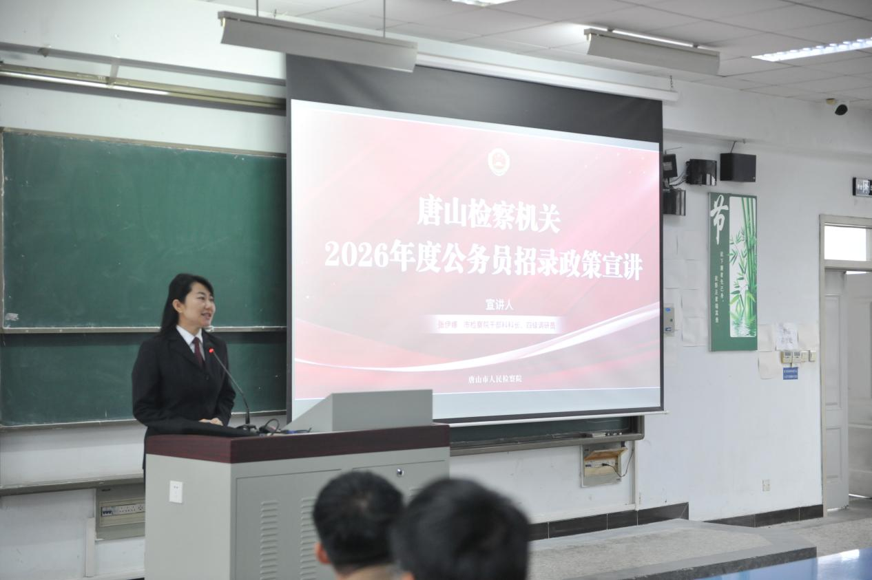 为帮助法学专业毕业生精准把握公务员报考方向,2025年10月17日上午,历史文化与法学系特邀唐山市人民检察院干部科科长张伊娜同志,为法学毕业生作2026年检察院系统公务员招录政策专题宣讲,提供权威报考指导。