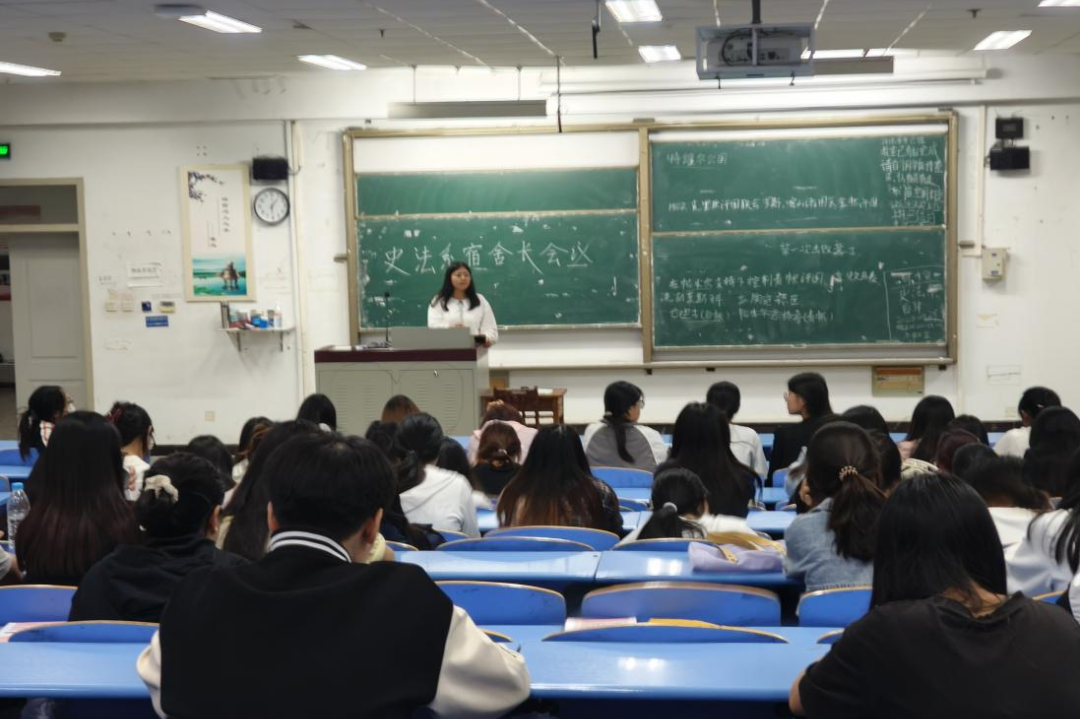 进一步规范宿舍管理,营造安全、整洁、有序的住宿环境,2025年9月28日,历史文化与法学系在文三阶梯教室组织召开宿舍长专题工作会议,全体宿舍长参会,会议围绕阳台清理、电动车管理、宿舍安全及查寝责任等核心工作作出部署。