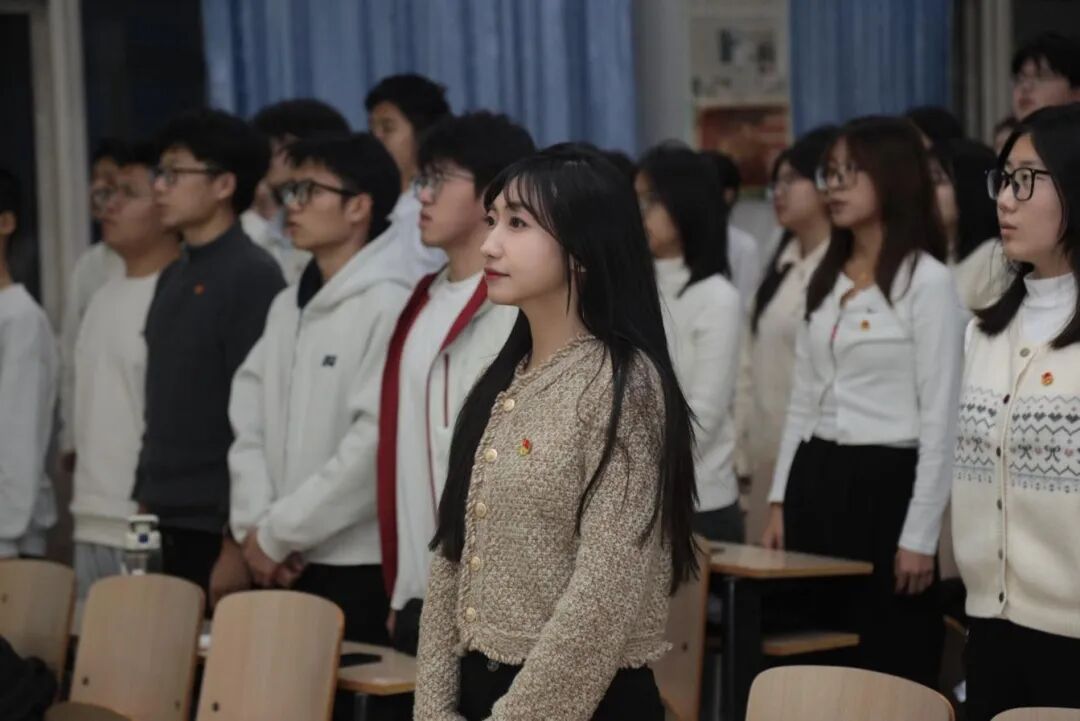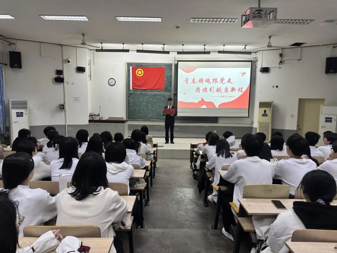 仪式在庄严的氛围中开始,全体人员面向国旗肃立,高唱《中华人民共和国国歌》,铿锵的旋律激荡人心。随后,团务统筹部部长时域清宣读了新团员名单,现场响起阵阵热烈的掌声,大家向新团员的加入表达诚挚的祝贺。紧接着,仪式进入庄严的团徽颁发环节。新团员们郑重地将团徽佩戴在左胸前,闪耀的团徽象征着荣耀,更意味着使命与责任的承接。在宣誓环节,全体新团员面向团旗,高举右拳,在新团员代表的领誓下庄严宣誓,铿锵的誓言在现场久久回荡。