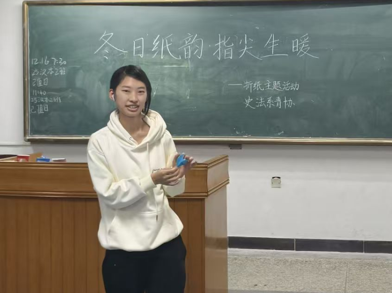 冬日虽寒校园暖,折纸互动促交流。为了缓解冬天的沉闷与寒冷,增进组织的交流互动,发扬传统折纸文化,历史文化与法学系青年志愿者协会于2025年12月16日19:00—20:00举办“冬日纸韵,指尖生暖”折纸主题活动。史法系青协成员们积极参与,齐聚北院文307教室,留下了冬天的美好回忆与优秀的折纸作品。